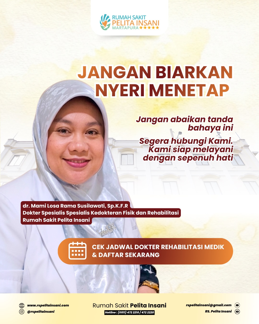 Jadwalkan pemeriksaan Anda bersama dr. Mami Losa Rama Susilawati, Sp.K.F.R (Dokter Spesialis Kedokteran Fisik & Rehabilitasi) di RS Pelita Insani sekarang juga.